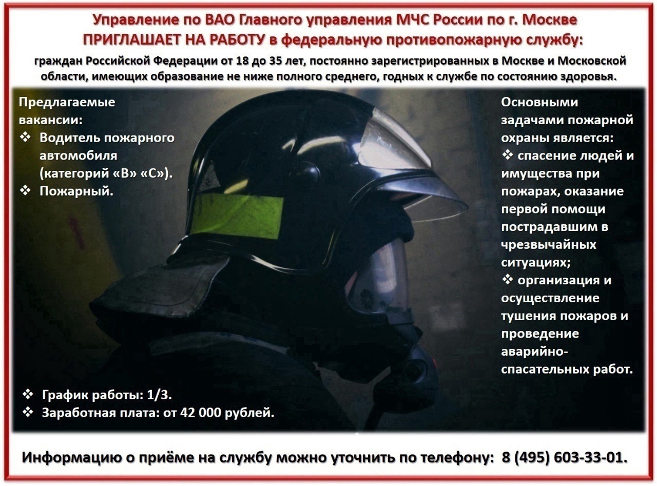 Управление по ВАО Главного управления МЧС России по г. Москве ПРИГЛАШАЕТ НА РАБОТУ в федеральную противопожарную службу