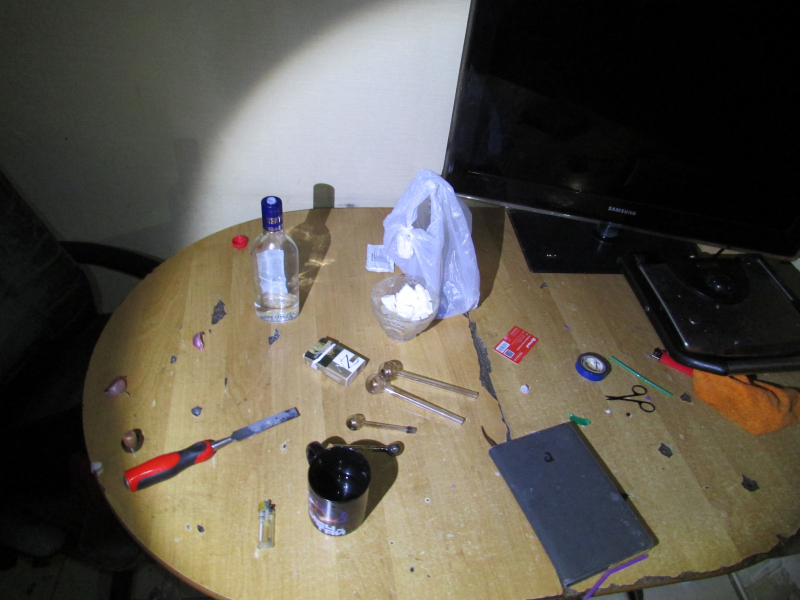 В результате обследования квартиры полицейские обнаружили предметы, свидетельствующие об употреблении наркотических средств, в частности, стеклянные и металлическая колбы с неизвестным веществами. По изъятым предметам назначена комплексная экспертиза.