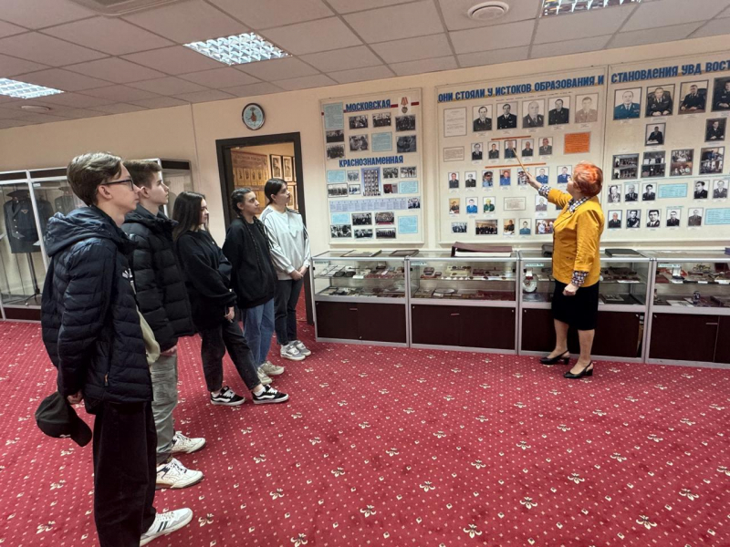 В продолжении экскурсии член Общественного совета при УВД, председатель Совета ветеранов Надежда Козлова пригласила школьников в комнату истории, где рассказала об образовании Управления по Восточному округу, ознакомила с памятными стендами, посвященными участию сотрудников органов внутренних дел в Великой Отечественной войне. В комнате хранятся исторические фотографии тех лет и боевые награды бойцов-милиционеров.